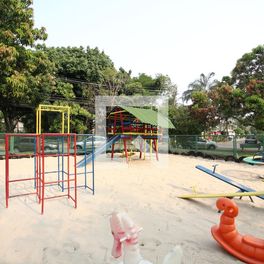 Ele dispõe de espaço coberto para entreter as crianças.