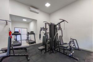 Ele dispõe de espaço coberto para entreter as crianças, quadra para a prática de esportes e equipamentos para a prática de exercícios.