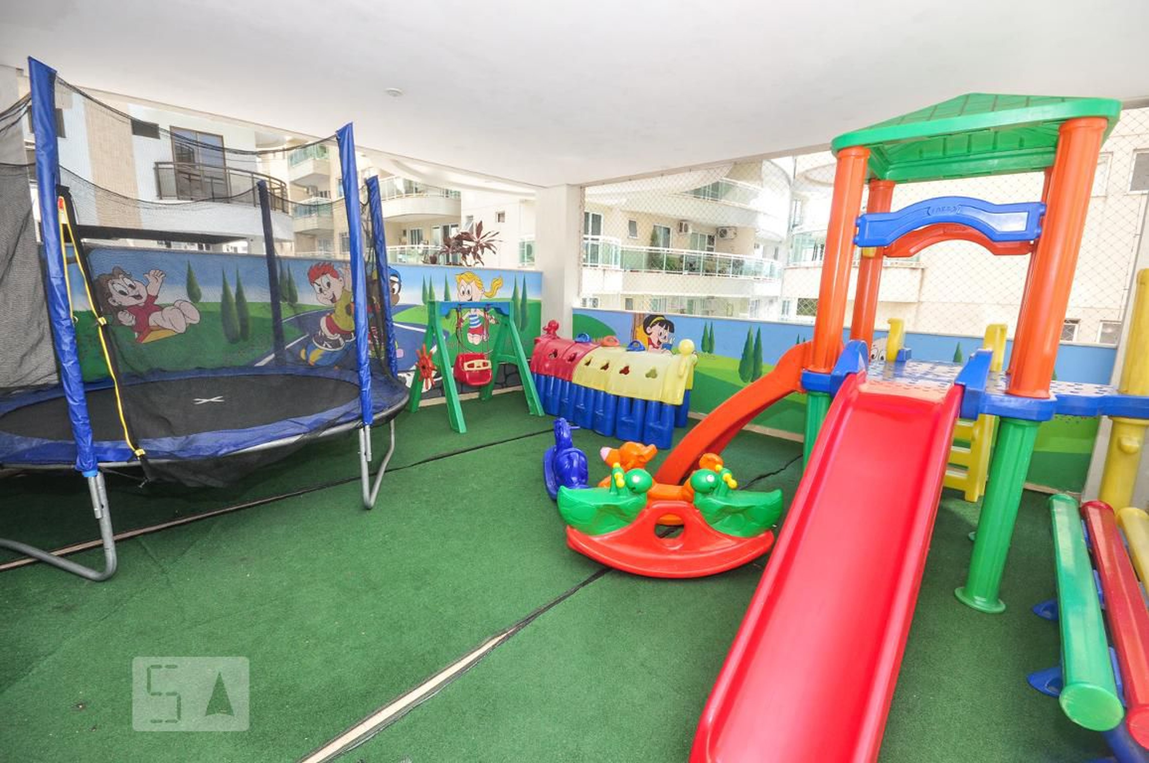 Ele dispõe de espaço coberto para entreter as crianças.