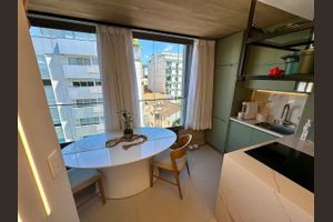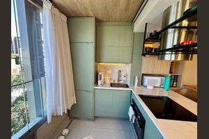 Ele dispõe de ambiente intimista para cozinhar e receber visitas.