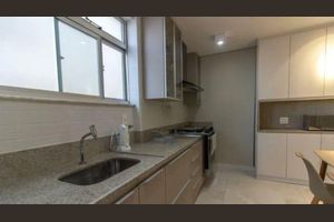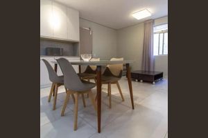 Ele dispõe de ambiente intimista para cozinhar e receber visitas.