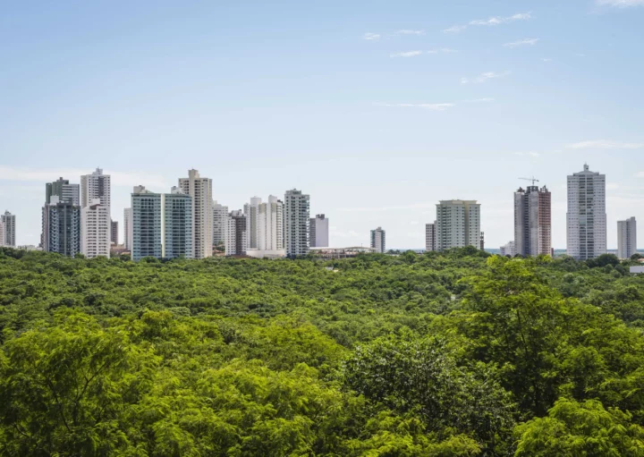 Imagem da linha do horizonte de Cuiabá mostra vegetação e prédios ao fundo para ilustrar matéria sobre as melhores capitais do Brasil
