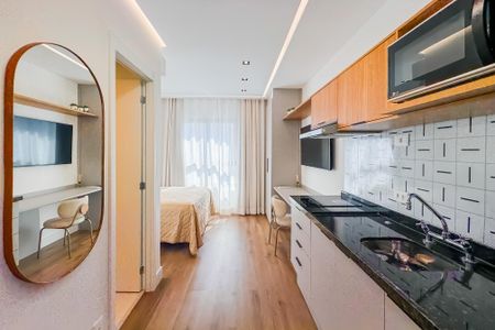 Studio bem localizado na Rua Vergueiro, próximo a supermercados, escola, padaria, açougue, metrô, restaurantes. Ele possui uma ampla janela que permite uma ótima iluminação do ambiente. Ele já eletrodosméticos, cama, armários, ar condicionado, chuveiro. O condomínio possui academia, lavanderia e espaço gourmet.