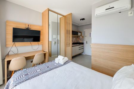 Estudio Setin totalmente mobiliado, cama queen,ar condicionado quente e frio, fogão elétrico, micro-ondas, frigobar, chuveiro a gas alta pressão, TV plana 65 polegadas,,academia, lavanderia, espaço home office, piscina, mini mercado,,cortnas ,fechadura eletronica,portaria 24 horas, ambiente moderno e organizado.