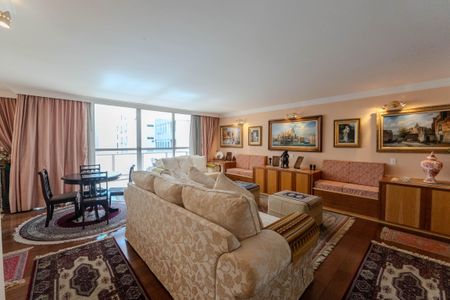Apartamento um por andar. Quatro dormitórios, uma suite com closet, 1 dos dormitórios transformado em estúdio. Amplas salas living e de jantar, piso de taco de madeira totalmente mobiliadas com sofás, poltronas, mesas de jantar e suporte, cadeiras e decoradas com quadros, spots e tapetes. Dois banheiros completos que atendem os demais dormitórios. Lavabo. Copa/Cozinha. Quarto e banheiro de empregada. Todo apartamento com armários embutidos. Amplo terraço. 3 garagens. Elevador social privativo.