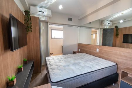 Excelente studio, distante 650m do metrô [LINK_REMOVIDO] mobiliado e equipado com cama box de casal, armários e gabinetes, escrivaninha, smart tv 40", geladeira, cook top indução, microondas, liquidificador, filtro d'água, secador de cabelo, ferro de passar, aspirador de pó, utensílios de limpeza, panelas, pratos , copos, talheres e utensílios em geral, AR- Condicionado piscina coberta, fitness center, sauna, lounge bar, barbearia, espaço mulher, lavanderia OMO.