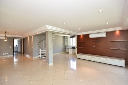 Ampla cobertura, em rua fechada com guarita, duplex, com 4 suítes, com churrasqueira sendo um sala intima no andar superior e área de lazer, piscina e churrasqueira. No andar inferior amplo living com lareira compondo sala de visitas/ estar e jantar integradas à grande varanda com vista livre do bairro. Espaçosa cozinha com despensa e lavanderia/ área de serviços com armários Kitchens e dependências de empregada e 3 suítes com armários Ornare, com 5 vagas e 330m2 e 4 suítes.