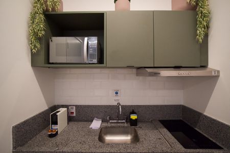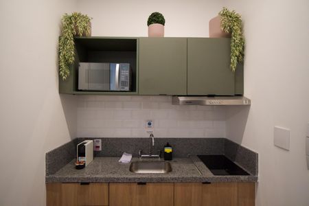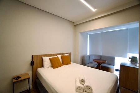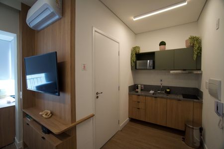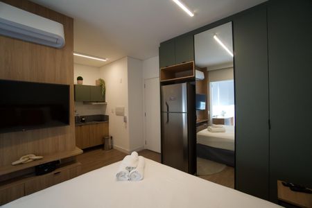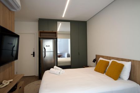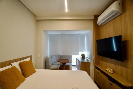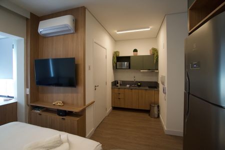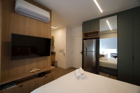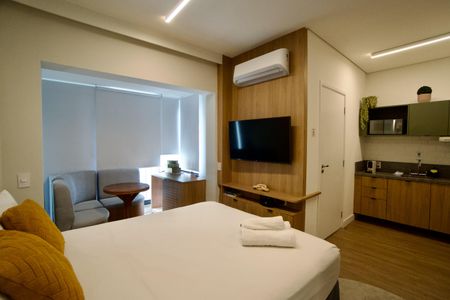 Studio finamente decorado com planejados, ar condicionado, TV, micro-ondas, cooktop, geladeira, cama, Box Blindex. Num condomínio com portaria 24h, academia, piscina, salão de festas e jogos, lavanderia, próximo da Estação Oscar Freire.