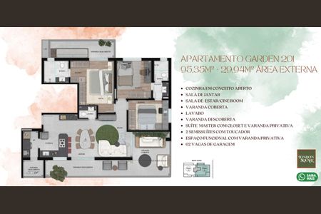 Apartamento Garden com área total de 125m². Com varanda, Lavabo e área de serviço. Em construção pela incorporadora parceira (imagens ilustrativas). Previsão de entrega: 2/2027. Projeto arquivado no nº 2 Cartório de Registro de Imóveis Cidade/MG (R-46460). Previsão de entrega, valores e condições de pagamento sujeitos a alterações. Para mais informações, contate os nossos atendentes.