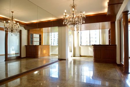 Apartamento com 3 salas, amplas, sendo sala de estar, sala de jantar, sala de TV, uma das salas comporta dois ambientes, com piso em granito, as outras possuem piso em tábua corrida, 4 quartos com armários, sendo, 2 suítes com armários, box, espelhos e piso em granito, suíte principal com, hidromassagem, varanda, closet e ar-condicionado, banheiro social com armário, espelho e box, lavabo, cozinha com armários planejados, despensa, louceiro, dependência completa de empregada, com 2 quartos.
