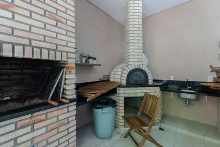 Apartamento à venda com 34m², 1 quarto e 1 vagaPátio com churrasqueira e forno de pizza, com mesa e cadeira de madeira, e piso de cerâmica.