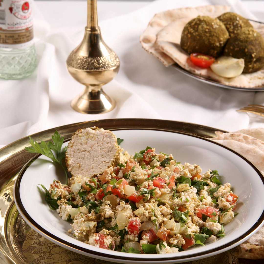Os pratos salgados incluem os principais itens da culinária do Oriente Médio, como mjadra (arroz com lentilha e cebola), charutos de folha de parreira e repolho, salada fatuche, espeto de kafta e chancliche. Não deixe de provar a exclusividade da casa: a saborosa berinjela gratinada com carne.