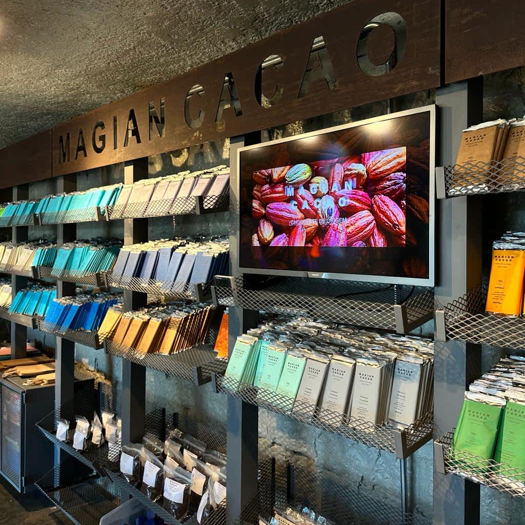 Depois que os grãos chegam à fábrica da Magian Cacao, eles são selecionados, torrados, descascados, moídos, conchados (processo em que pasta de cacau e os restantes ingredientes são misturados em uma máquina própria chamada concha), temperados, moldados, cristalizados e só depois embalados. Na loja, que fica no mesmo endereço da fábrica, você pode comprar mais de 20 diferentes tipos de chocolates da marca.